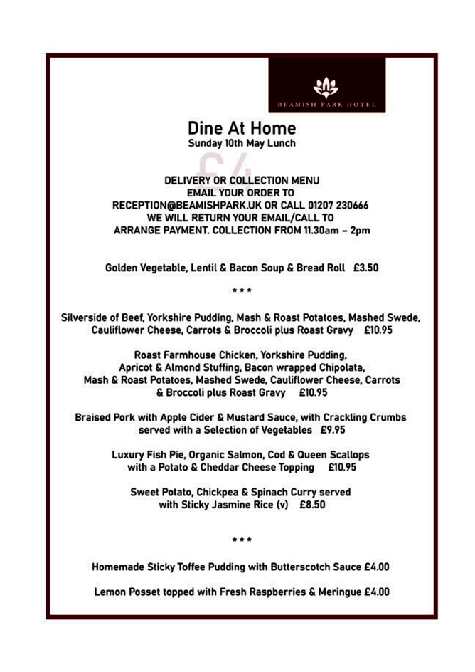 We are now offering ‘Dine At Home’ Sunday Lunch for collection and free deliveries in NE16 & DH9 for orders £50+ or a delivery charge of £5 for orders under £50. It was very successful last Sunday – we have diversified from our very popular lunches in the Bistro to Takeaway, all meals come with full re-heating instructions. Just a note: our bedrooms are open for NHS & Keyworkers if there are any requirements in the area.