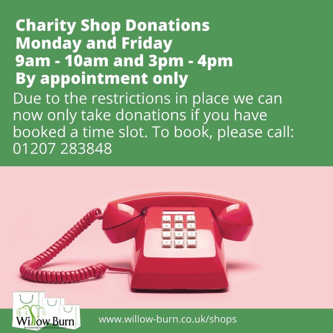 Due to the number of donations received and the restrictions placed upon us, please ring and book a timeslot to leave a donation at our Stanley and Consett shops (Consett taking donations from 27 July). Donation slots can be booked for Mondays and Fridays, between 9 a.m. - 10 a.m. and 3 p.m. - 4 p.m. If you haven't made a booking or you arrive on another day, we won't be able to accept your donation. We know this isn't ideal, however we have a duty of care to customers, staff and volunteers and we need to ensure our processes are safe.