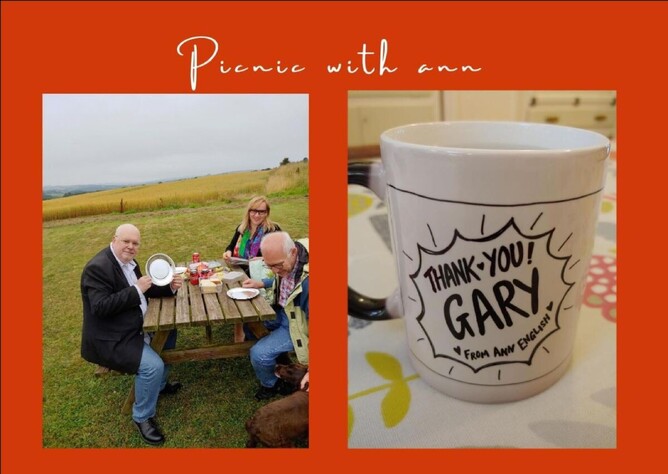 It was lovely to have a picnic and catch up with Ann English (and Molly!) last week. The cold weather didn't stop us having a great time and talking non-stop for two hours! At the end, Ann surprised us with a special gift. I'd never seen a "magic reveal" mug before and you can imagine how much bouncing there was in the middle of the Derwent Manor Hotel when we filled the mug with hot water and it revealed Ann's brilliant artwork . . .