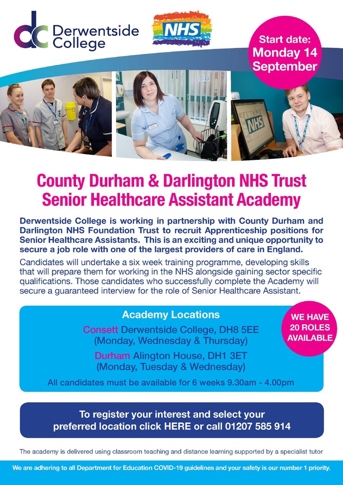 Derwentside College is working in partnership with County Durham and Darlington NHS Foundation Trust to recruit Apprenticeship positions for Senior Healthcare Assistants in the Stockton, Darlington, Consett & Durham areas.
