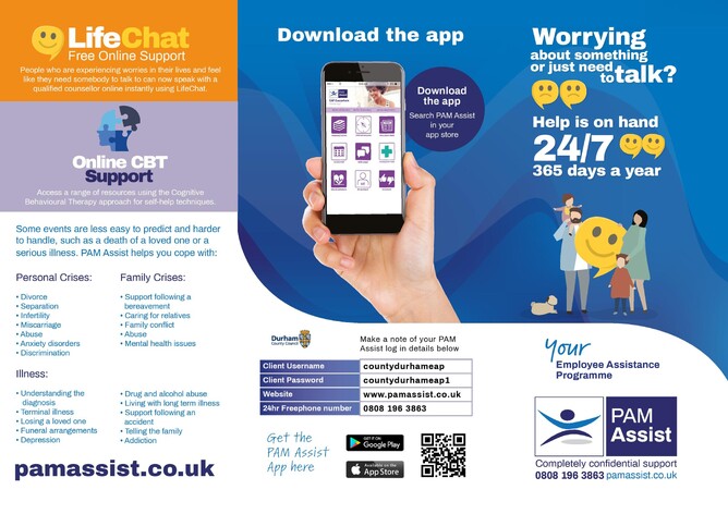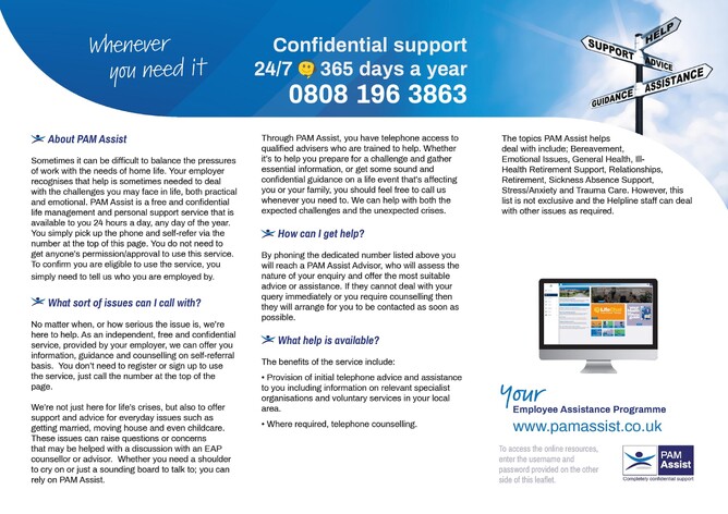 By calling the Freephone number: 0808 196 3863 businesses have instant access to PAM Assist a 24 hour confidential support service for both yourselves and your employees. Callers will be able to access specialist advice around a number of issues: