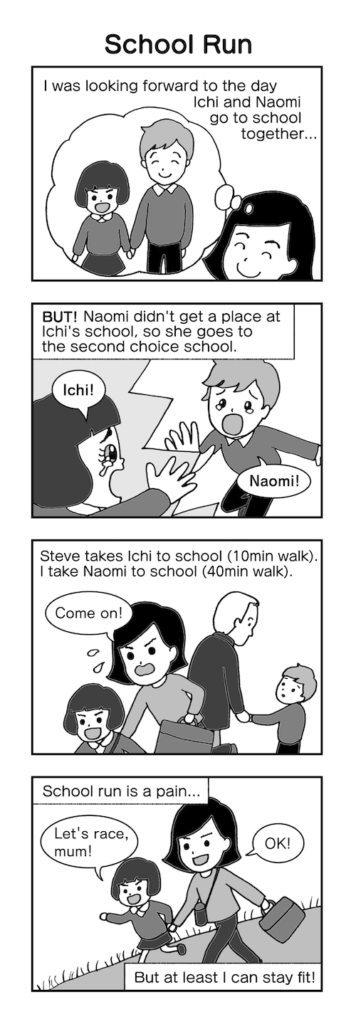 Luckily my husband and I both work from home. We decided to share school run between us. My husband takes Ichi to school and I take Naomi to school. It takes 10 minutes to walk to Ichi’s school, but it takes 40 minutes to walk to Naomi’s school. I considered driving but I don’t want to drive busy roads, so I decided to walk. In the morning, I walk 40 minutes to school and 40 minutes to return home. Then at 2:30pm, I do the same. This is about two and a half hours worth of exercise!