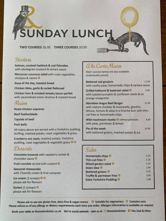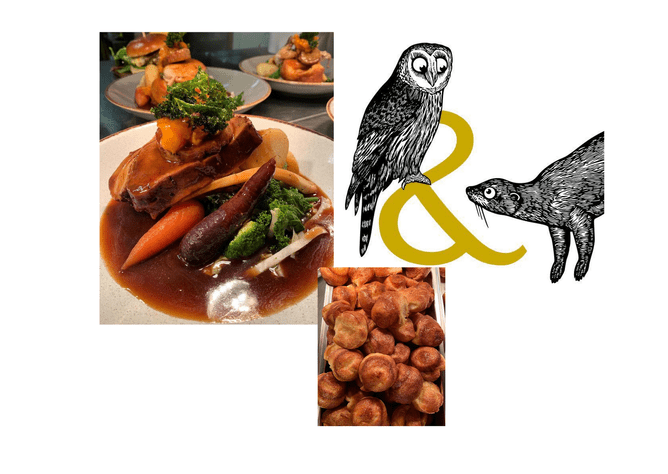 The Owl & Otter: Choose from Beef Featherblade, Topside of Beef, Roast Chicken, Pork Belly or Nut Roast.
