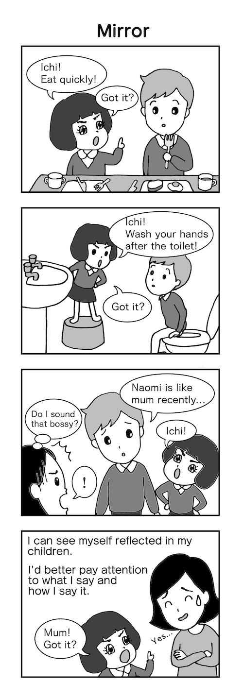 Children are like mirrors. They reflect what they see and what they hear. After hearing Naomi speaking to Ichi in a commanding tone, I felt embarrassed with myself. I’d better watch out what I say and how I say it!