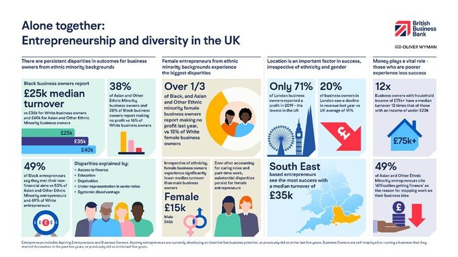 The British Business Bank, in collaboration with Oliver Wyman, is today publishing a landmark study: “Alone, together: Entrepreneurship and Diversity in the UK”. This report shows in detail the challenges facing the UK’s entrepreneurs. Looking at ethnicity, gender, place and money, a sobering picture emerges that calls for commitment and action. The research will feed into the Commission on Race and Ethnic Disparities established by the Prime Minister.