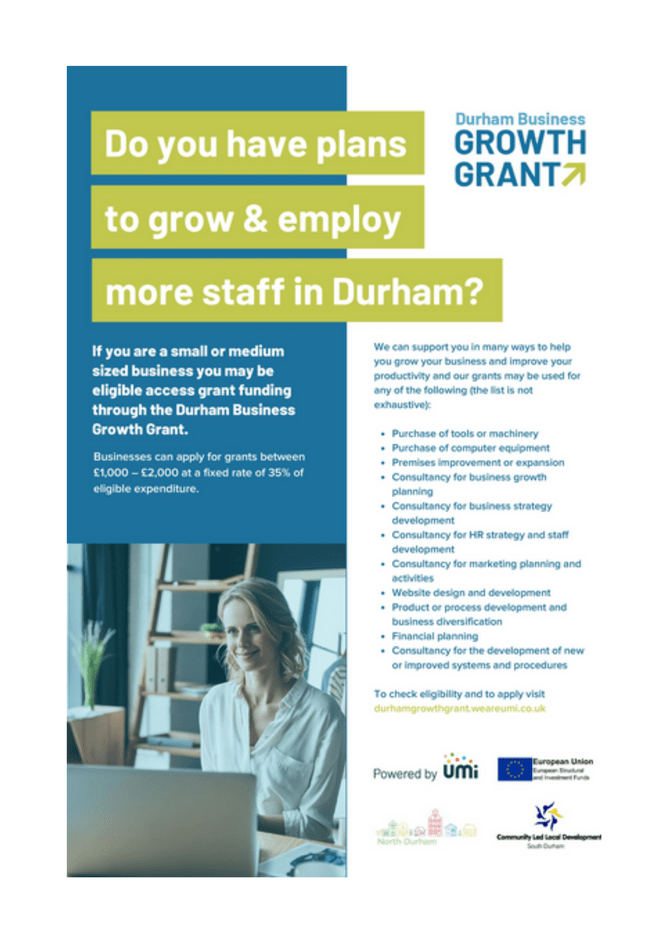 If you are a small or medium sized business based in an eligible postcode with plans to grow and potentially employ more staff, you may be eligible to access grant funding through the Durham Business Growth Grant.