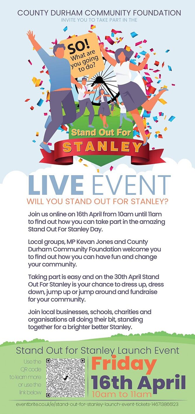 On behalf of the County Durham Community Foundation and the Stanley Fund, I am delighted to invite you to join us online for the launch of Stand Out For Stanley Day. The launch invitation is attached and will take place on Friday, 16th April at 10am and you can now register to join us online by clicking on the image.