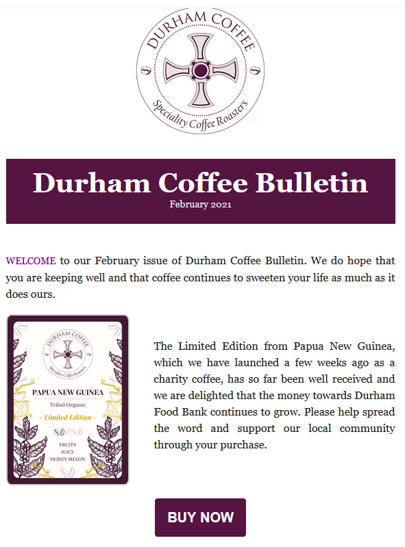 Our latest Durham Coffee Bulletin is now available. Join the Durham Coffee Community and stay connected with all our latest news and offers. Just click here to receive your own copy of the bulletin.