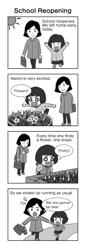 On the first day of school after a nearly 3 month closure. We left home with plenty of time. Naomi is excited. Fresh air. Flowers. Birds. Dogs. Every little thing makes her happy.