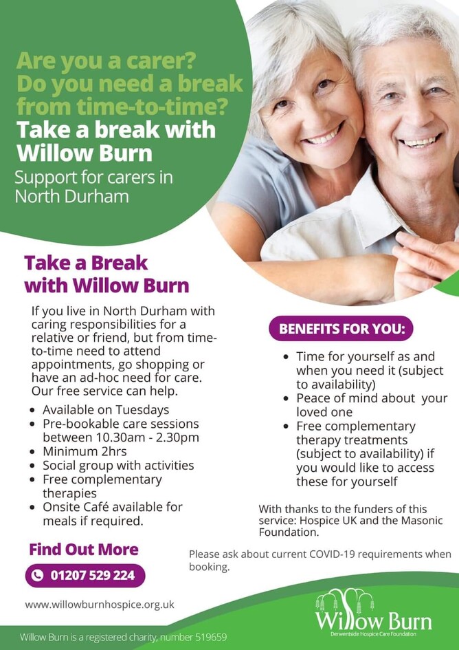 Are you a carer in North Durham? Do you need a break from time-to-time? Take a break with Willow Burn Hospice. If you live in North Durham with caring responsibilities for a relative or friend, but from time-to-time need to attend appointments, go shopping or you have an ad-hoc need for care. Our free service can help.
