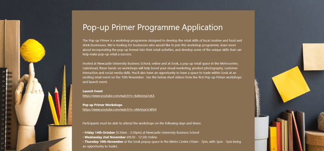 Hosted at Newcastle University Business School, online and at Sook, a pop-up retail space in the Metrocentre, Gateshead, these hands-on workshops will help boost your visual marketing, product photography, customer interaction and social media skills. You’ll also have an opportunity to have a space to trade within Sook at an exciting retail event on the 10th November. See the below short videos from the first Pop-up Primer workshops and launch event.