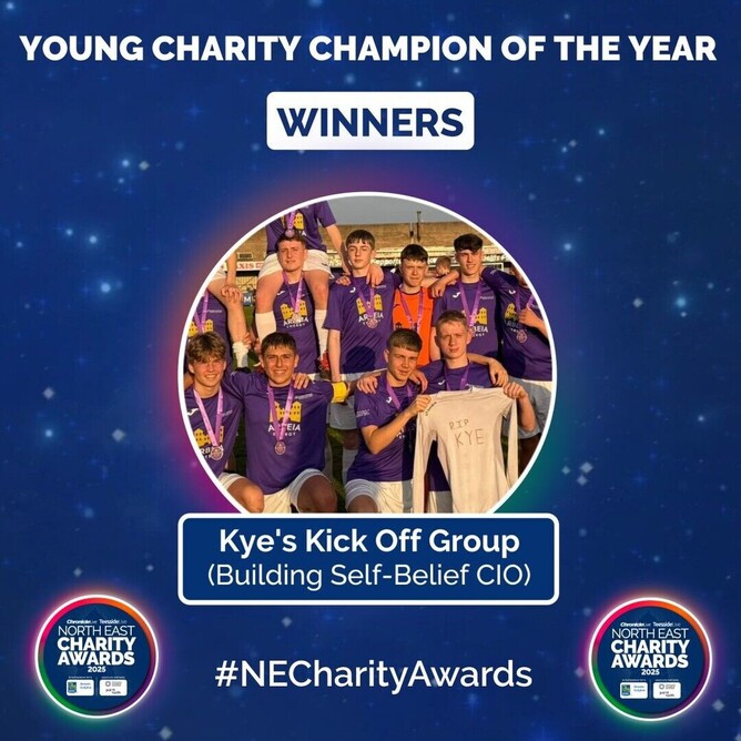 "What an amazing achievement, our Kye's Kick Off team won the Young Charity Champions of the Year at the 2025 North East Charity Awards. We are so proud of the team, they fully deserve such recognition for their dedication to their dear friend Kye."