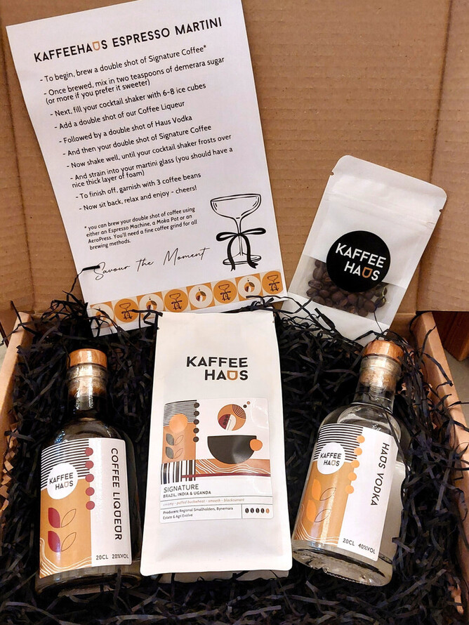 KAFFEEHAUS' Espresso Martini Gift Sets include a bottle of Haus Vodka (distilled by WL Distillery), a bottle of their joint Coffee Liqueur, a bag of their Signature Coffee (available in beans or espresso grind) and of course some coffee beans for garnishing your drink as well as a recipe card for our favourite cocktail.