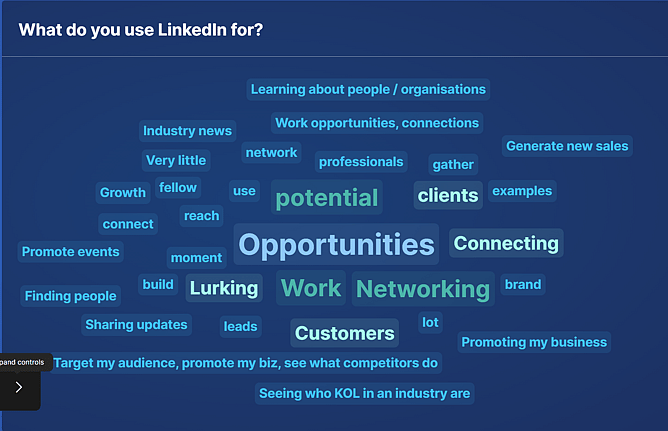 The image above illustrates the primary reasons our workshop attendees use LinkedIn. We thought this was an interesting snapshot of our community's priorities—whether it’s for lead generation, brand awareness, or peer-to-peer networking.
